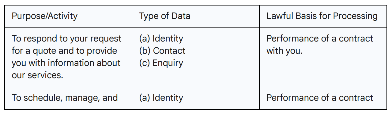 Enquiry Data: Includes any information you provide in the “Message” field of our contact form, detailing your specific cleaning requirements.
